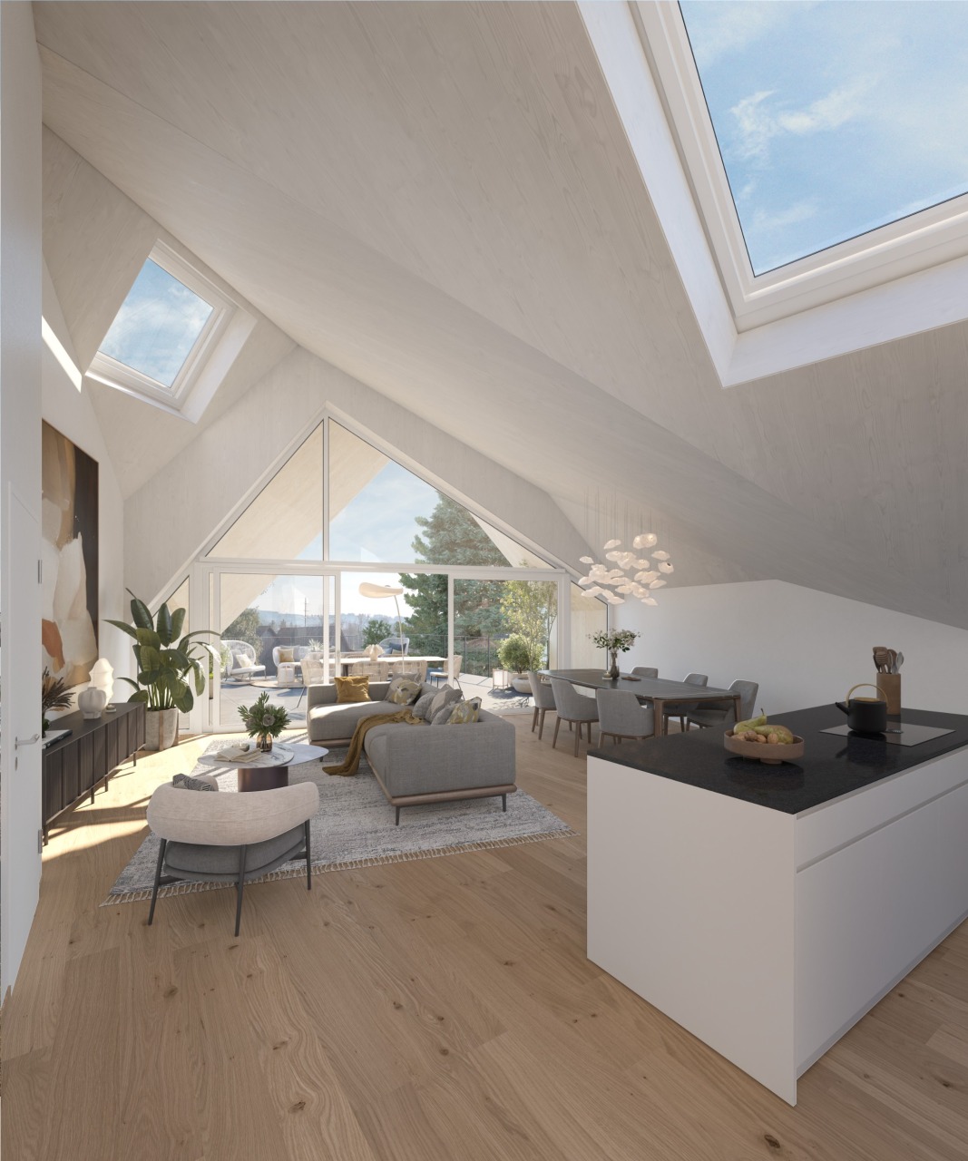 Venthura bietet eine vielfältige Auswahl an Wohnungstypen: Im Erdgeschoss entstehen Wohnungen mit privaten Gartenflächen, im Obergeschoss Einheiten mit großzügigen Balkonen und im Attikageschoss zwei exklusive 3½-Zimmer-Wohnungen mit großflächigen Terrassen und gigantischen Raumhöhen. Besonders hervorzuheben ist die nachhaltige Bauweise mit Holzelementen im oberen Bereich, die nicht nur eine natürliche Wohnatmosphäre schafft, sondern auch zur energieeffizienten Bauweise beiträgt. Großzügige Fensterflächen, durchdachte Grundrisse, schwellenlose Zugänge sowie hochwertige Materialien und eigene Waschtürme in jeder Einheit unterstreichen den gehobenen Anspruch des Projekts.